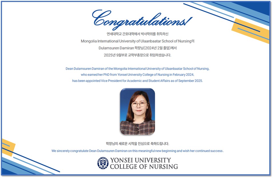 News [Spotlight] Appointment of Dean Dulamsuren Damiran as Vice President for Academic and Student Affairs 관리자 2025-09-12 조회수 516 공유하기 공유하기 페이스북 네이버블로그 카카오톡 카카오스토리 닫기 목록 이전글연세대학교 간호대학생, '유일한 아카데미' 수상 다음글연세대 간호대학 석사과정생 3명, 홍콩중문대 PhD Summer Workshop 추천 및 참여