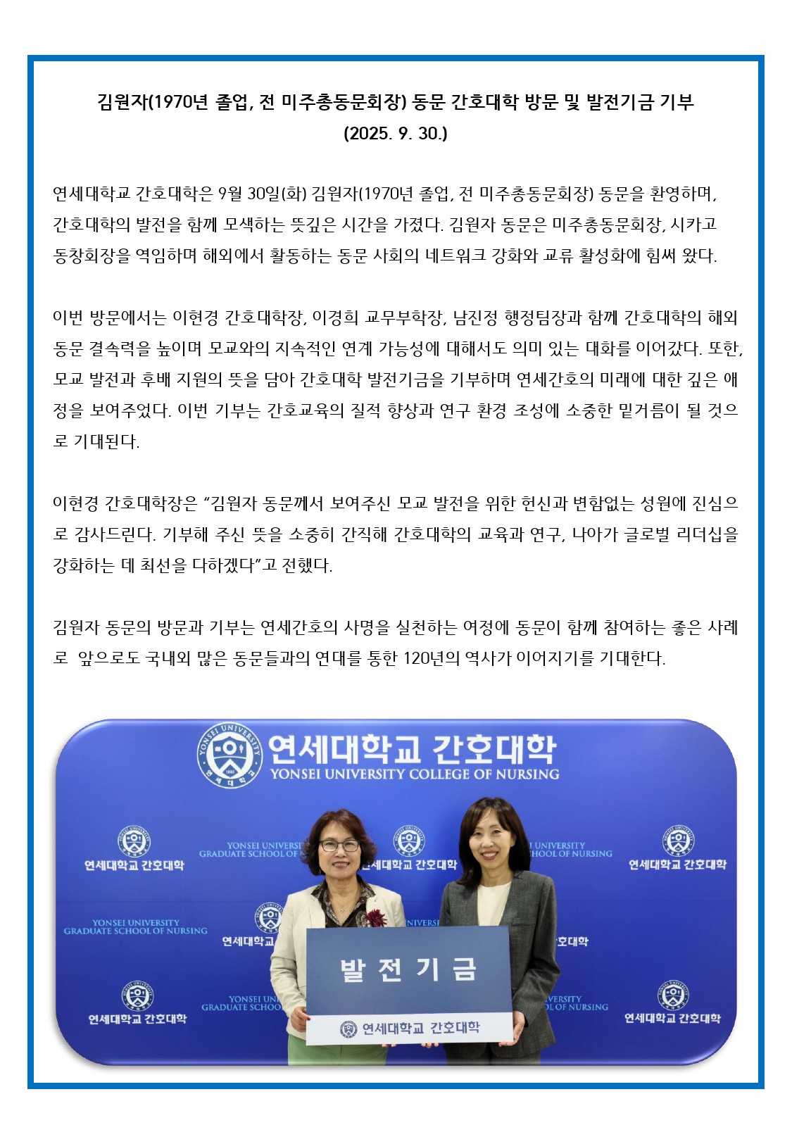 News 김원자(1970년 졸업, 전 미주총동문회장) 동문 간호대학 방문 및 발전기금 기부 [2025.09.30] 관리자 2025-10-01 조회수 364 공유하기 공유하기 페이스북 네이버블로그 카카오톡 카카오스토리 닫기 목록 이전글연세대학교 간호대학, 메풀 전산초 명예교수 기념 학술대회 개최 "차세대 간호과학자 양성: 혁신적 연구·교육·정책” 주제로 미래 발전 방향 모색" 다음글다음글이 없습니다.